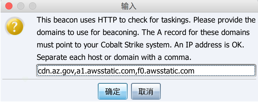 注意host填的地址。并且要注意端口一定要是80。之后再填入我们找的那些高信誉域名地址,比如cdn.az.gov,当然可以填入多个,以,隔开即可: