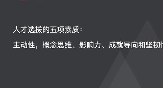 所以,从选人的入口开始,就要选出具备干部潜质的人——参考人才选拔的五项素质(主动性,概念思维、影响力、成就导向和坚韧性)等标准。