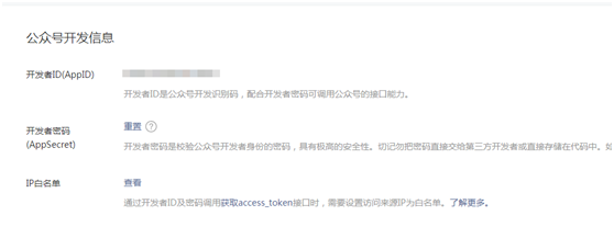 (2)在公众号获取appid 和secret 并把服务器的ip地址设置在IP白名单中(位置在:开发->基本配置)
