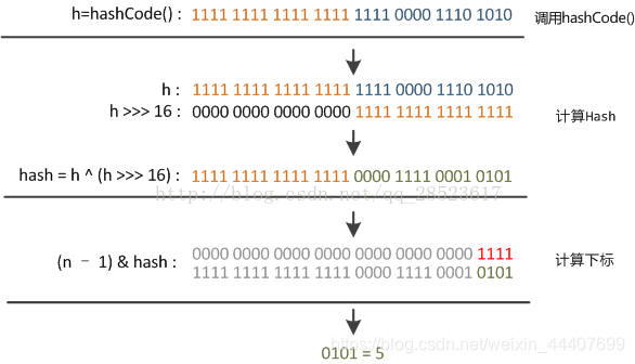 首先我们先用key的hashcode值的高16位与低16位做一次按位异或操作(函数扰动)计算出一个 hash值,然后使用这个hash值和n-1(n为数组长度,因为hashmap每次扩容都为原来的2倍,所以数组长度一直是2的幂次方,所以n-1通常是后几位全1)做一次按位与操作,由此,取最后几位,得出一个数组下标,即这个key-value应该存在这个桶(桶的概念就是例如有一个长度为4的数组,将每一个数组元素都比喻为一个桶,也就是有4个桶)中