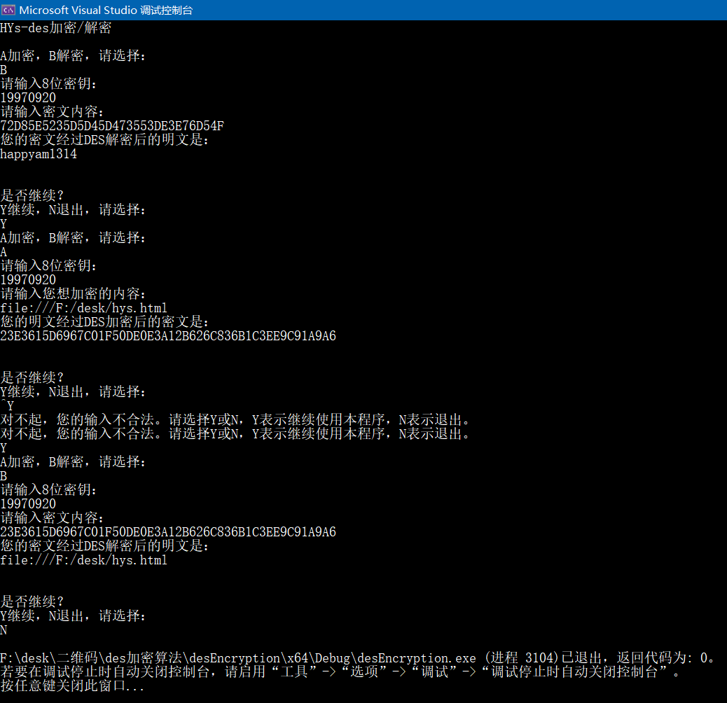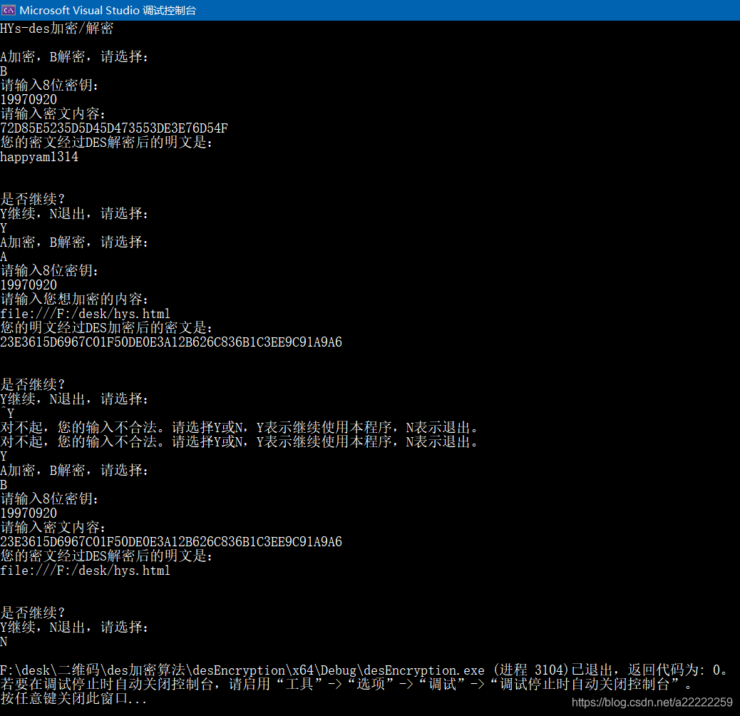 { //声明变量char MingWen[104]; //存放原始的明文char target[8]; //将明文断成8个字符的一个分组char InputKey[9]; //存放字符型的八位密钥int text[64]; //存放一个分组转成二进制后的数据int text_ip[64]; //存放第一次初始换位的结果int L0[32], Li[32]; //将64位分成左右各32位进行迭代int R0[32], Ri[32];int RE0[48]; //存放右半部分经过E表扩展换位后的48位数据int key[64]; //存放密钥的二进制形式int keyPC1[56]; //存放密钥key经过PC1换位表后变成的56位二进制int A[28]; //将keyPC1分成左右两部分,左部A,右部B,各28位,以便进行循环左移int B[28];int keyAB[56]; //将循环左移后两部分的结果合并起来int K[16][48]; //存放16次循环左移产生的子密钥int RK[48]; //存放RE和K异或运算后的结果int RKS[8]; //存放经过查找8个S表后得到的8个十进制结果int SP[32]; //将RKS表中的十进制数化成二进制int RKSP[32]; //存放SP表经过P盒换位后的结果int text_end[64]; //存放经过左右32位换位后的结果int text_out[14][64]; //存放初始化向量和所有经过DES的分组的二进制char init[9] = { "HTmadeit" }; //设置初始化向量为“HTmadeit”int CBC[64];int result[13][64];int H[208];char MiWen[208];int C[832];int M[13][8];char choice;int t;int i, j;int k, l, m, n;int r[8], c[8];int flag = 1;int IP[64] = { //初始换位表58, 50, 42, 34, 26, 18, 10, 2,60, 52, 44, 36, 28, 20, 12, 4,62, 54, 46, 38, 30, 22, 14, 6,64, 56, 48, 40, 32, 24, 16, 8,57, 49, 41, 33, 25, 17, 9, 1,59, 51, 43, 35, 27, 19, 11, 3,61, 53, 45, 37, 29, 21, 13, 5,63, 55, 47, 39, 31, 23, 15, 7};int E[48] = { //扩展换位表32, 1, 2, 3, 4, 5,4, 5, 6, 7, 8, 9,8, 9, 10, 11, 12, 13,12, 13, 14, 15, 16, 17,16, 17, 18, 19, 20, 21,20, 21, 22, 23, 24, 25,24, 25, 26, 27, 28, 29,28, 29, 30, 31, 32, 1 };int PC1[56] = { //PC1换位表(64—>56)57, 49, 41, 33, 25, 17, 9,1, 58, 50, 42, 34, 26, 18,10, 2, 59, 51, 43, 35, 27,19, 11, 3, 60, 52, 44, 36,63, 55, 47, 39, 31, 23, 15,7, 62, 54, 46, 38, 30, 22,14, 6, 61, 53, 45, 37, 29,21, 13, 5, 28, 20, 12, 4 };int move[16] = { //循环移位表1,1,2,2,2,2,2,2,1,2,2,2,2,2,2,1 };int PC2[48] = { //PC2换位表(56—>48)14, 17, 11, 24, 1, 5,3, 28, 15, 6, 21, 10,23, 19, 12, 4, 26, 8,16, 7, 27, 20, 13, 2,41, 52, 31, 37, 47, 55,30, 40, 51, 45, 33, 48,44, 49, 39, 56, 34, 53,46, 42, 50, 36, 29, 32 };int S1[4][16] = { //S换位表14, 4, 13, 1, 2, 15, 11, 8, 3, 10, 6, 12, 5, 9, 0, 7,0, 15, 7, 4, 14, 2, 13, 1, 10, 6, 12, 11, 9, 5, 3, 8,4, 1, 14, 8, 13, 6, 2, 11, 15, 12, 9, 7, 3, 10, 5, 0,15, 12, 8, 2, 4, 9, 1, 7, 5, 11, 3, 14, 10, 0, 6, 13};int S2[4][16] = {15, 1, 8, 14, 6, 11, 3, 4, 9, 7, 2, 13, 12, 0, 5, 10,3, 13, 4, 7, 15, 2, 8, 14, 12, 0, 1, 10, 6, 9, 11, 5,0, 14, 7, 11, 10, 4, 13, 1, 5, 8, 12, 6, 9, 3, 2, 15,13, 8, 10, 1, 3, 15, 4, 2, 11, 6, 7, 12, 0, 5, 14, 9};int S3[4][16] = {10, 0, 9, 14, 6, 3, 15, 5, 1, 13, 12, 7, 11, 4, 2, 8,13, 7, 0, 9, 3, 4, 6, 10, 2, 8, 5, 14, 12, 11, 15, 1,13, 6, 4, 9, 8, 15, 3, 0, 11, 1, 2, 12, 5, 10, 14, 7,1, 10, 13, 0, 6, 9, 8, 7, 4, 15, 14, 3, 11, 5, 2, 12};int S4[4][16] = {7, 13, 14, 3, 0, 6, 9, 10, 1, 2, 8, 5, 11, 12, 4, 15,13, 8, 11, 5, 6, 15, 0, 3, 4, 7, 2, 12, 1, 10, 14, 9,10, 6, 9, 0, 12, 11, 7, 13, 15, 1, 3, 14, 5, 2, 8, 4,3, 15, 0, 6, 10, 1, 13, 8, 9, 4, 5, 11, 12, 7, 2, 14};int S5[4][16] = {2, 12, 4, 1, 7, 10, 11, 6, 8, 5, 3, 15, 13, 0, 14, 9,14, 11, 2, 12, 4, 7, 13, 1, 5, 0, 15, 10, 3, 9, 8, 6,4, 2, 1, 11, 10, 13, 7, 8, 15, 9, 12, 5, 6, 3, 0, 14,11, 8, 12, 7, 1, 14, 2, 13, 6, 15, 0, 9, 10, 4, 5, 3};int S6[4][16] = {12, 1, 10, 15, 9, 2, 6, 8, 0, 13, 3, 4, 14, 7, 5, 11,10, 15, 4, 2, 7, 12, 9, 5, 6, 1, 13, 14, 0, 11, 3, 8,9, 14, 15, 5, 2, 8, 12, 3, 7, 0, 4, 10, 1, 13, 11, 6,4, 3, 2, 12, 9, 5, 15, 10, 11, 14, 1, 7, 6, 0, 8, 13};int S7[4][16] = {4, 11, 2, 14, 15, 0, 8, 13, 3, 12, 9, 7, 5, 10, 6, 1,13, 0, 11, 7, 4, 9, 1, 10, 14, 3, 5, 12, 2, 15, 8, 6,1, 4, 11, 13, 12, 3, 7, 14, 10, 15, 6, 8, 0, 5, 9, 2,6, 11, 13, 8, 1, 4, 10, 7, 9, 5, 0, 15, 14, 2, 3, 12};int S8[4][16] = {13, 2, 8, 4, 6, 15, 11, 1, 10, 9, 3, 14, 5, 0, 12, 7,1, 15, 13, 8, 10, 3, 7, 4, 12, 5, 6, 11, 0, 14, 9, 2,7, 11, 4, 1, 9, 12, 14, 2, 0, 6, 10, 13, 15, 3, 5, 8,2, 1, 14, 7, 4, 10, 8, 13, 15, 12, 9, 0, 3, 5, 6, 11};int P[32] = { //P换位表16,7,20,21,29,12,28,17,1,15,23,26,5,18,31,10,2,8,24,14,32,27,3,9,19,13,30,6,22,11,4,25};printf("HYs-des加密/解密\n\n");while (flag){printf("A加密,B解密,请选择:\n");scanf("%c", &choice);while (choice != 'A' && choice != 'B' && choice != 'a' && choice != 'b'){printf("对不起,您的输入不合法。请选择A或B,A表示加密,B表示解密。\n");scanf("%c", &choice);}getchar();//生成子密钥printf("请输入8位密钥:\n");gets_s(InputKey);while (InputKey[7] == '\0' || InputKey[8] != '\0'){printf("您输入的密钥位数有误,请重新输入8位密钥:\n");gets_s(InputKey);}for (i = 0; i < 8; i++) //将密钥转化成64位二进制数放到一维数组key中{int a[8] = { 0,0,0,0,0,0,0,0 };m = InputKey[i];for (j = 0; m != 0; j++){a[j] = m % 2;m = m / 2;}for (j = 0; j < 8; j++)key[(i * 8) + j] = a[7 - j];}//for(i=0;i<64;i++)//printf("%d,",key[i]);for (i = 0; i < 56; i++) //通过PC1换位表变成56位密钥放在keyPC1中keyPC1[i] = key[PC1[i] - 1];for (i = 0; i < 28; i++) //分成A和B两部分,各28位{A[i] = keyPC1[i];B[i] = keyPC1[i + 28];}for (t = 0; t < 16; t++){if (move[t] == 1) //按照循环移位表将Ai和Bi分别左移move[t]位{n = A[0];for (i = 0; i < 27; i++)A[i] = A[i + 1];A[27] = n;n = B[0];for (i = 0; i < 28; i++)B[i] = B[i + 1];B[27] = n;}else{n = A[0];m = A[1];for (i = 0; i < 26; i++)A[i] = A[i + 2];A[26] = n;A[27] = m;n = B[0];m = B[1];for (i = 0; i < 26; i++)B[i] = B[i + 2];B[26] = n;B[27] = m;}for (i = 0; i < 28; i++) //将A和B合并成56位{keyAB[i] = A[i];keyAB[i + 28] = B[i];}for (i = 0; i < 48; i++) //通过PC2换位表变成48位密钥K[t][i] = keyAB[PC2[i] - 1];}//for(t=0;t<16;t++) //for(i=0;i<48;i++)// printf("%d,",K[t][i]);for (i = 0; i < 8; i++) //