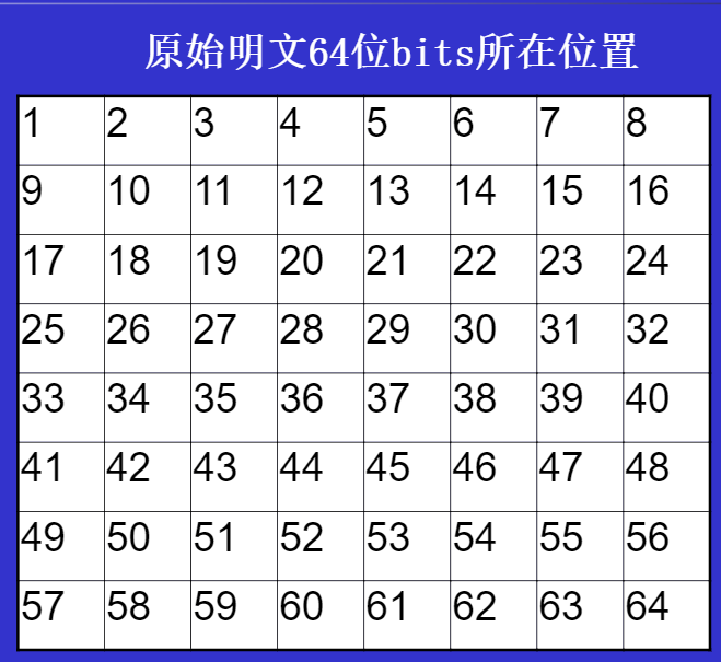 其功能是把输入的64位数据块按位重新组合,并把输出分为L0、R0两部分,每部分各长32位,其置换规则为将输入的第58位换到第一位,第50位换到第2位……依此类推,最后一位是原来的第7位。L0、R0则是换位输出后的两部分,L0是输出的左32位,R0是右32位