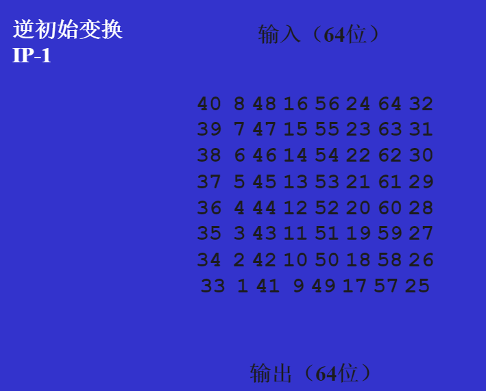 将初始置换进行16次的迭代,即进行16层的加密变换,这个运算过程我们暂时称为函数f。得到L16和R16,将此作为输入块,进行逆置换得到最终的密文输出块。逆置换是初始置换的逆运算。从初始置换规则中可以看到,原始数据的第1位置换到了第40位,第2位置换到了第8位。则逆置换就是将第40位置换到第1位,第8位置换到第2位。以此类推,逆置换规则如下
