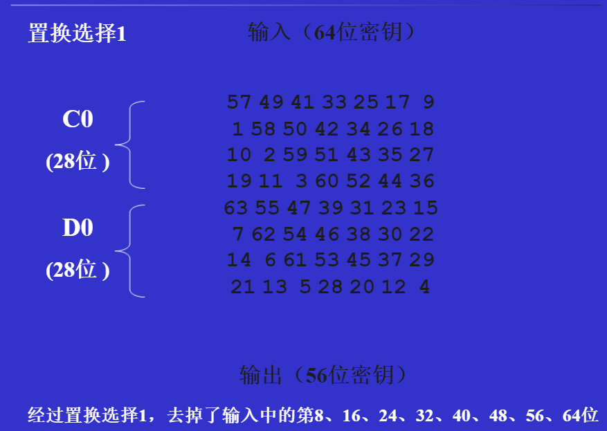 操作对象是64位秘钥,64位秘钥降至56位秘钥不是说将每个字节的第八位删除,而是通过缩小选择换位表1(置换选择表1)的变换变成56位。如下:56位秘钥分成C0和D0,各28位: