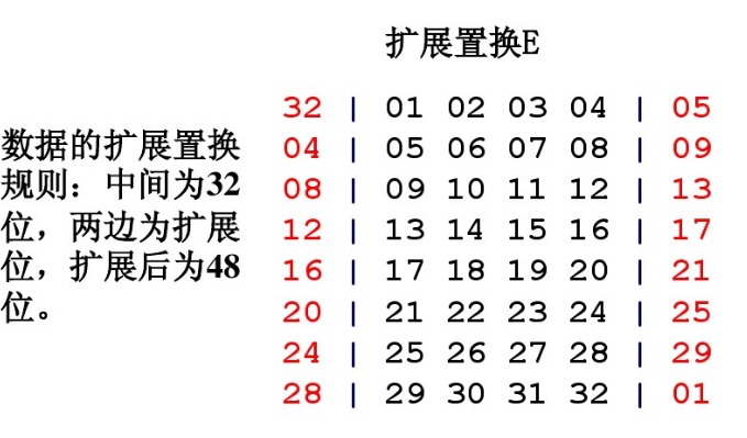 通过扩展置换E,数据的右半部分Rn从32位扩展到48位。扩展置换改变了位的次序,重复了某些位。