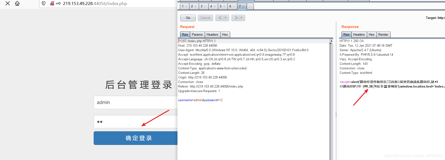 输入任意的用户名和密码点击登录后显示,非法登录,服务器记录了我们的ip地址。也就是说将该IP写到了数据库中;竟然跟数据库有交互,那么可以猜想,此处可能存在SQL注入漏洞;接下来继续确认