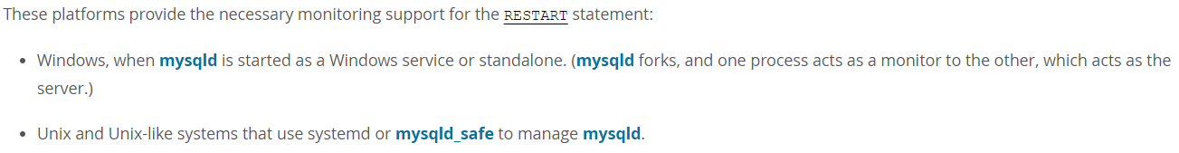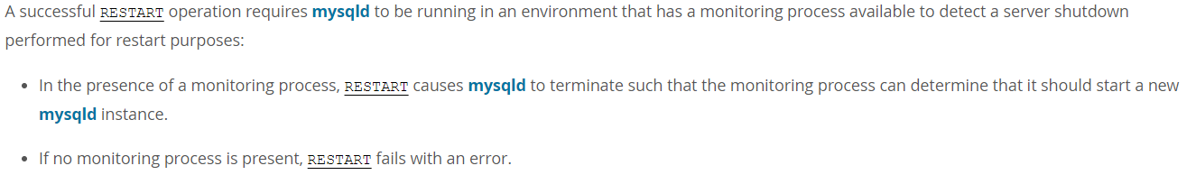 先看关于 RESTART 的相关官方文档说明(https://dev.mysql.com/doc/refman/8.0/en/restart.html):