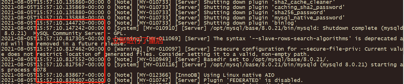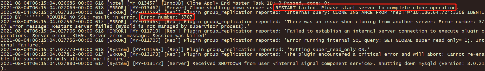 日志报错提示 RESTART 失败,需要在后面手动重启,错误代码3707,即:ERROR 3707 (HY000): Restart server failed (mysqld is not managed by supervisor process)。
