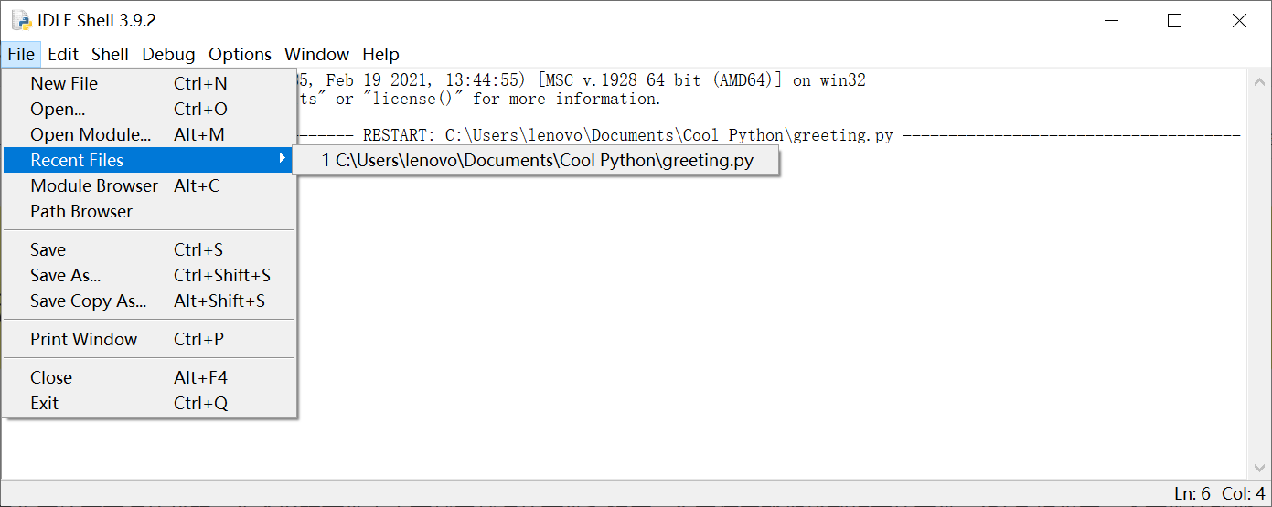 一旦你开始写更多的代码,你会发现文件夹中有越来越多的文件和程序。为了便于我们找到想要的文件,IDLE 提供了一个有趣的功能,它可以帮助我们记录最近打开并使用过的一系列文件。要打开最近编辑过的文件,只需要单击菜单上的 File, 然后在弹出的下拉菜单中选择 Recent Files 命令,如下图所示。