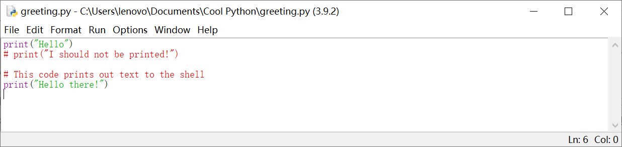 所以在上图中,计算机将会执行第一行代码,显示出 Hello, 并直接跳过第二行代码。因为我们输入的这个 “井” 字符( # )命令计算机不要执行这段代码!哈哈,有趣吧?