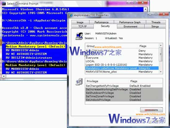 看来D:/Users/Admin/AppData/Roaming/Unispim目录的完整性级别一定比IE进程高,所以IE进程才无法写入该目录。那么如何查看目录的完整性级别呢?非常可惜Windows Vista目前还没有提供查看的工具。不过幸运的是,Sysinternals所提供的AccessChk可以方便地进行查看。