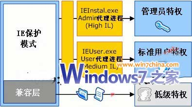 Windows Vista把传统的IE进程一分为三,分别负责不同安全等级的任务。把最常用的、无需特权的网页浏览任务交给IE进程本身去完成;把中等特权的任务(例如保存图片),交给用户级代理进程(ieuser.exe)去完成;把高特权的任务(例如安装加载项),交给管理级代理进程去完成(ieinstal.exe)。而老版本的Windows则是把所有的任务,不管其所需的安全等级,都交由一个IE进程去完成。以下的截图源自微软官方网站,由笔者对其进行“汉化”,仅供参考。