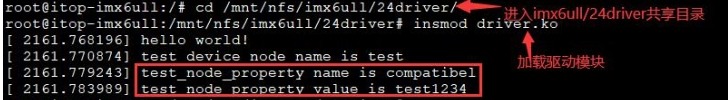 {printk("hello world! \n");/***********添加我们要查找的节点的代码**************************///of_find_node_by_path 函数通过路径查找节点test_device_node = of_find_node_by_path("/test");if (test_device_node == NULL){//判断是否查找节点成功printk("of_find_node_by_path is error \n");return -1;} //打印节点的名字printk("test_device_node name is %s\n", test_device_node->name);/**********获取 compatible 属性内容的代码************************/// of_find_property 函数查找节点属性test_node_property = of_find_property(test_device_node, "compatible", &size);if (test_node_property == NULL){//判断是否查找到节点属性内容printk("test_node_property is error \n");return -1;} //打印属性 compatible 的名字printk("test_node_property name is %s\n", test_node_property->name);//打印属性 compatible 的值printk("test_node_property value is %s\n", (char *)test_node_property->value);return 0;