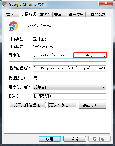 2、右键chrome快捷方式,点击属性 --> 快捷方式,在“目标”的尾部加上 --kiosk-printing 注意--前有一个空格