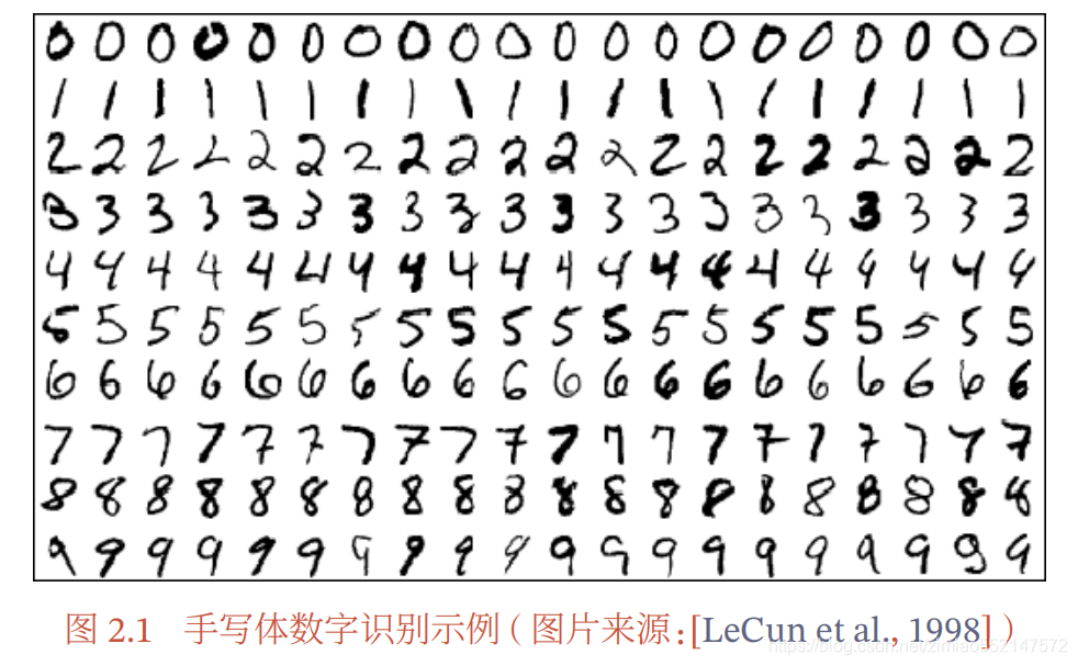 通俗地讲 , 机器学习 ( Machine Learning , ML ) 就是 让计算机从数据中进 行自动学习 , 得到某种知识 ( 或规律 ) . 作为一门学科 , 机器学习通常指一类问题 以及解决这类问题的方法 , 即如何从观测数据 ( 样本 ) 中寻找规律 , 并利用学习 到的规律 ( 模型 ) 对未知或无法观测的数据进行预测 . 在早期的工程领域 , 机器学习也经常称为 模式识别 ( Pattern Recognition , PR ), 但模式识别更偏向于具体的应用任务 , 比如光学字符识别 、 语音识别 、 人脸 识别等 . 这些任务的特点是 , 对于我们人类而言 , 这些任务很容易完成 , 但我们不 知道自己是如何做到的 , 因此也很难人工设计一个计算机程序来完成这些任务 . 一个可行的方法是设计一个算法可以让计算机自己从有标注的样本上学习其中 的规律 , 并用来完成各种识别任务 . 随着机器学习技术的应用越来越广 , 现在机 器学习的概念逐渐替代模式识别 , 成为这一类问题及其解决方法的统称 . 以手写体数字识别为例 , 我们需要让计算机能自动识别手写的数字 . 比如 图 2.1 中的例子 , 将 识别为数字 5 , 将 识别为数字 6 . 手写数字识别是一个经典 的机器学习任务 , 对人来说很简单 , 但对计算机来说却十分困难 . 我们很难总结 每个数字的手写体特征 , 或者区分不同数字的规则 , 因此设计一套识别算法是一 项几乎不可能的任务 . 在现实生活中 , 很多问题都类似于手写体数字识别这类问 题 , 比如物体识别 、 语音识别等 . 对于这类问题 , 我们不知道如何设计一个计算机 程序来解决 , 即使可以通过一些启发式规则来实现 , 其过程也是极其复杂的 . 因 此 , 人们开始尝试采用另一种思路 , 即让计算机 “ 看 ” 大量的样本 , 并从中学习到 一些经验 , 然后用这些经验来识别新的样本 . 要识别手写体数字 , 首先通过人工 标注大量的手写体数字图像 ( 即每张图像都通过人工标记了它是什么数字 ), 这 些图像作为训练数据 , 然后通过学习算法自动生成一套模型 ,并依靠它来识别新 的手写体数字 . 这个过程和人类学习过程也比较类似 , 我们教小孩子识别数字也 是这样的过程 . 这种通过数据来学习的方法就称为 机器学习 的方法 .