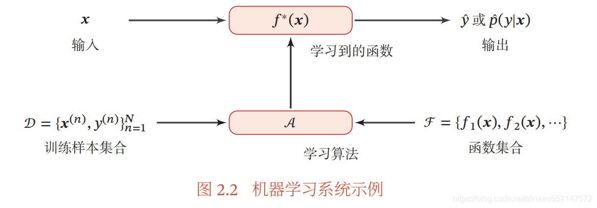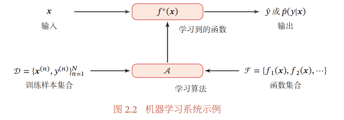 机器学习是从有限的观测数据中学习 ( 或 “ 猜测 ”) 出具有一般性的规律 , 并 可以将总结出来的规律推广应用到未观测样本上 . 机器学习方法可以粗略地分 为三个基本要素 : 模型 、 学习准则 、 优化算法 .2.2.1 模型