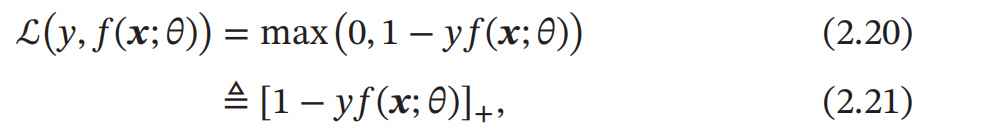 对于二分类问题 , 假设 𝑦 的取值为 {−1, +1} ,𝑓(𝒙; 𝜃) ∈ ℝ. Hinge 损失函数 ( Hinge Loss Function ) 为