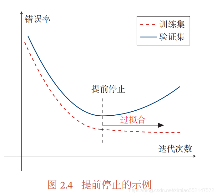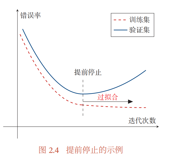 针对梯度下降的优化算法 , 除了加正则化项之外 , 还可以通过提前停止来防 止过拟合. 在梯度下降训练的过程中, 由于过拟合的原因 , 在训练样本上收敛的参数 , 并不一定在测试集上最优 . 因此 , 除了训练集和测试集之外 , 有时也会使用一 个 验证集 ( Validation Set ) 来进行模型选择,测试模型在验证集上是否最优. 验证集也叫作 开发集 (Development Set). 在每次迭代时, 把新得到的模型 𝑓(𝒙; 𝜃) 在验证集上进行测试,并计算错误率. 如果在验证集上的错误率不再下降,就停止迭代.这种策略叫 提前停止 ( Early Stop). 如果没有验证集 , 可以在训练集上划分出一个小比例的子集作为验证集 . 图 2.4 给出了提前停止的示例 .