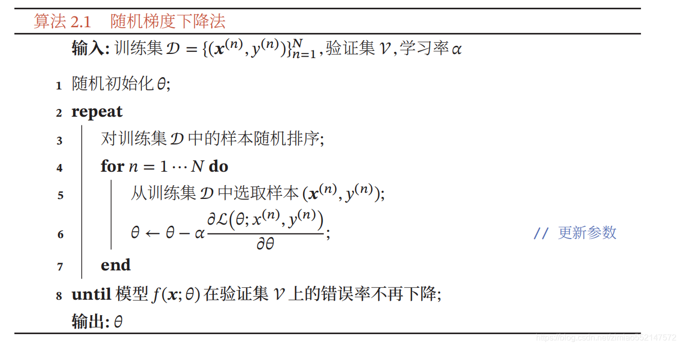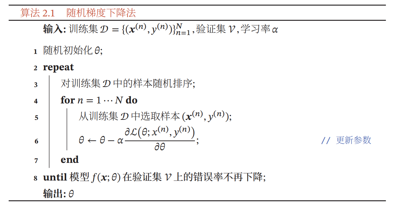 在公式 ( 2.27 ) 的梯度下降法中 , 目标函数是整个训练集上的风险函数 , 这种 方式称为 批量梯度下降法 ( Batch Gradient Descent , BGD ). 批量梯度下降法在 每次迭代时需要计算每个样本上损失函数的梯度并求和.当训练集中的样本数 量𝑁 很大时, 空间复杂度比较高,每次迭代的计算开销也很大. 在机器学习中 , 我们假设每个样本都是独立同分布地从真实数据分布中随 机抽取出来的, 真正的优化目标是期望风险最小.批量梯度下降法相当于是从 真实数据分布中采集 𝑁 个样本 , 并由它们计算出来的 经验风险 的梯度来近似 期 望风险 的梯度 . 为了减少每次迭代的计算复杂度,我们也可以在每次迭代时只 采集一个样本 , 计算这个样本损失函数的梯度并更新参数 , 即 随机梯度下降法 ( Stochastic Gradient Descent , SGD ). 随机梯度下降法也叫 作 增量梯度下降法 . 当经过足够次数的迭代时 , 随机梯度下降 也可以收敛到局部最优解[ Nemirovski et al. , 2009 ] . 随机梯度下降法的训练过程如算法 2.1 所示 .