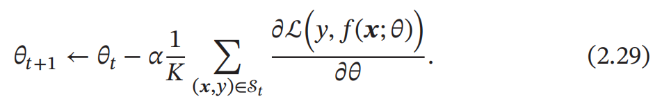 随机梯度下降法的一个缺点是无法充分利用计算机的并行计算能力 . 小批 量梯度下降法 ( Mini-Batch Gradient Descent ) 是批量梯度下降和随机梯度下 降的折中 . 每次迭代时 , 我们随机选取一小部分训练样本来计算梯度并更新参 数 , 这样既可以兼顾随机梯度下降法的优点,也可以提高训练效率. 第𝑡 次迭代时 , 随机选取一个包含𝐾 个样本的子集𝒮𝑡 , 计算这个子集上每个 样本损失函数的梯度并进行平均,然后再进行参数更新: