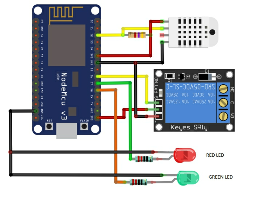 继电器模块连接到 GPIO 12 ,DHT22 连接到引脚 4,LEDs 和 GPIO 13 、 GPIO 15 连接,如下: