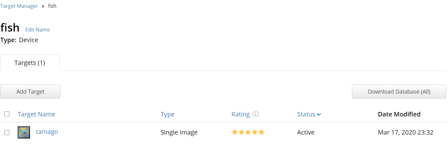 选择device类型即可,关于Vumark暂时还没有研究过,感兴趣的同学可以去搜搜看,网上也有相关教程。进入数据库,可以看到如下视图,target就是我们添加过的目标对象,一个数据库可以有多个识别目标,用名字区分,Rating的星星数越多它的可辨识度就越高,勾选需要的目标点击下载(建议保存到一个好记的地方),平台选择Unity就会自动生成一个unitypackage给你下载到本地。