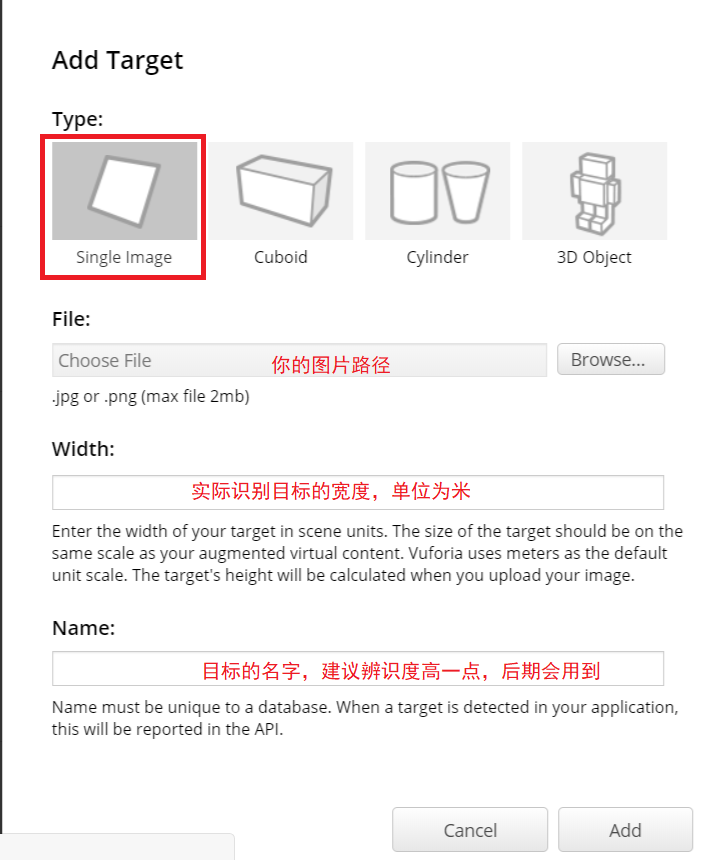 点击Add Target添加目标,这里选择最简单的的二维图像为目标,其他内容都在图片上进行了标注