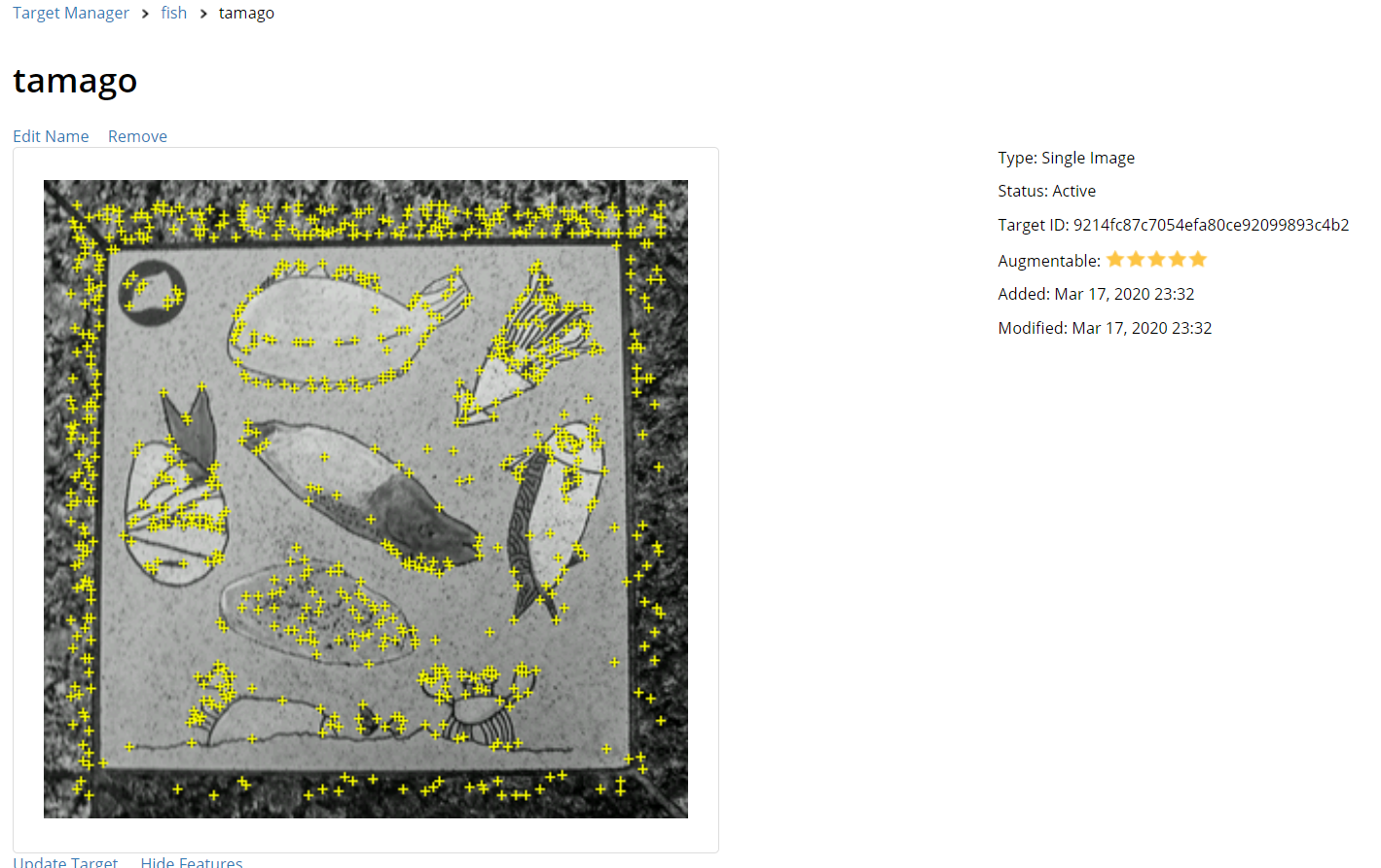 在数据库面板点击某个目标的名称可以看它的特征点,如下图,十字表示的是计算得到的特征点,特征点数越多,识别效率越高(需要点击图片下方的show feature):