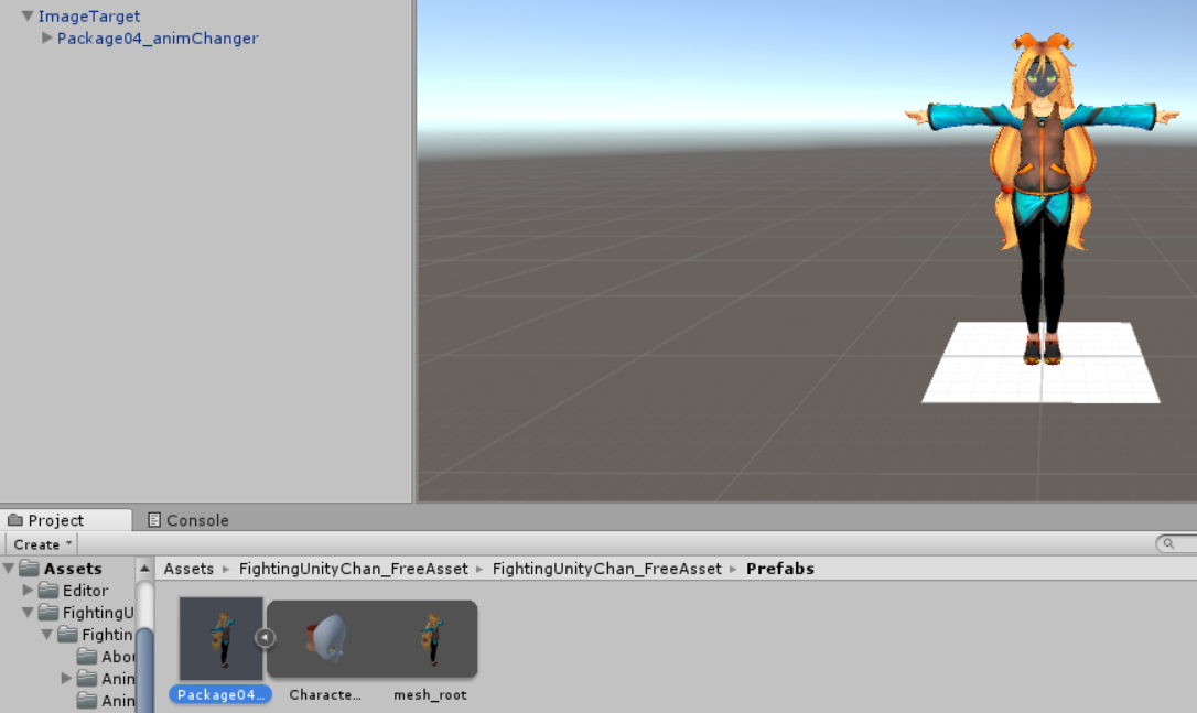 把刚刚下载好的数据库导入(在Assests面板点击鼠标右键->import pacage->custom package,选择下载的database就好了)以备用,这样的话一个AR应用需要的几个因素:识别目标、识别后的模型和对应功能相机就都有了,剩下的是配置的事情了