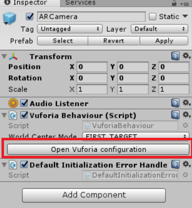 在ARCamera的Vuforia behavior组件下点击Open Vuforia configuration