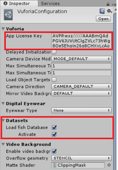 进入vuforia项目配置面板填写许可证并激活数据库: