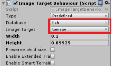 点击image target 在其右侧Image Target Behaviour中勾选数据库及识别图像
