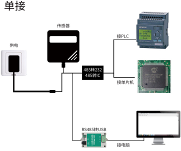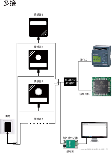 本产品也可以多个传感器组合在一条 485 总线使用,理论上一条总线可以接254个 485 传感器,另一端接入带有 485 接口的 PLC、通过 485 接口芯片连接单片机,或者使用 USB 转 485 即可与电脑连接,使用我公司提供的传感器配置工具进行配置和测试(在使用该配置软件时只能接一台设备)。