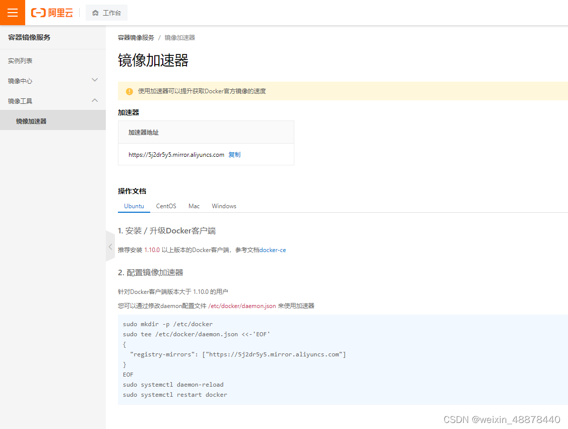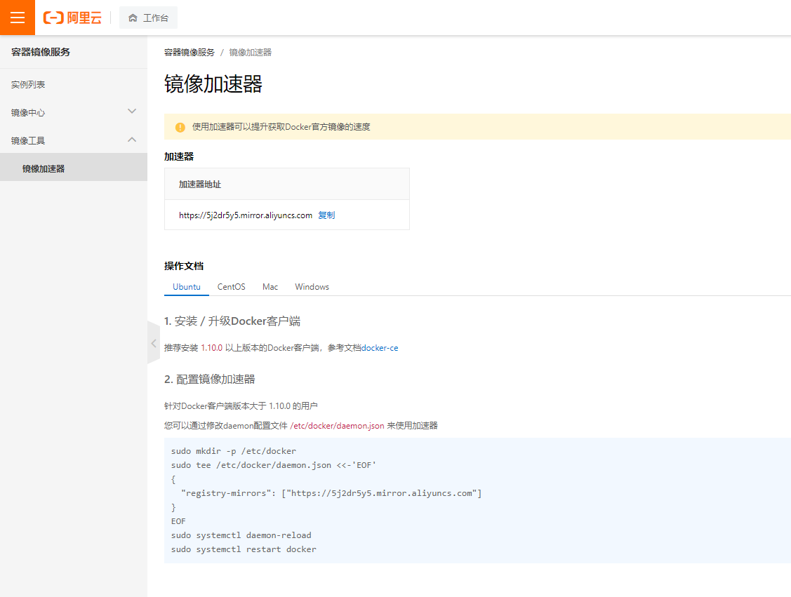每个用户分配到的地址不通,以我为例,我的地址是https://5j2dr5y5.mirror.aliyuncs.com。