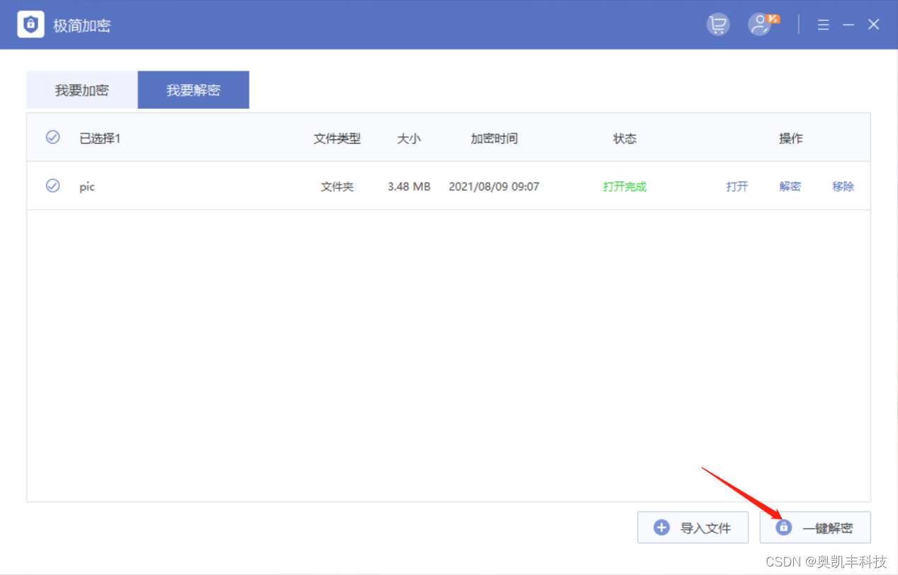 使用加密软件进行加密的文件,想要解密文件密码还是需要借助加密软件的帮助,一般来说,加密软件提供加密功能以外,一定会提供解密功能的,比如奥凯丰 极简加密。只要加密软件中的账户保持一致就能支持一键解除密码。