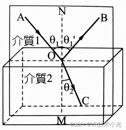 根据折射定律,入射角θ1,出射角θ2满足如下关系。n1sinθ1 = n2sinθ2