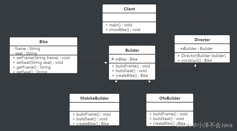 这里Bike是产品,包含车架,车座等组件;Builder是抽象建造者,MobikeBuilder和OfoBuilder是具体的建造者;Director是指挥者。类图如下: