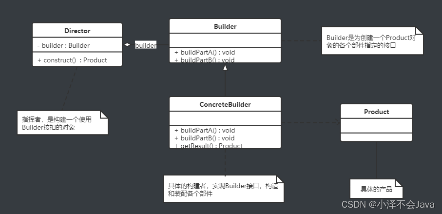 指挥者类(Director):调用具体建造者来创建复杂对象的各个部分,在指导者中不涉及具体产品的信息,只负责保证对象各部分完整创建或按某种顺序创建。