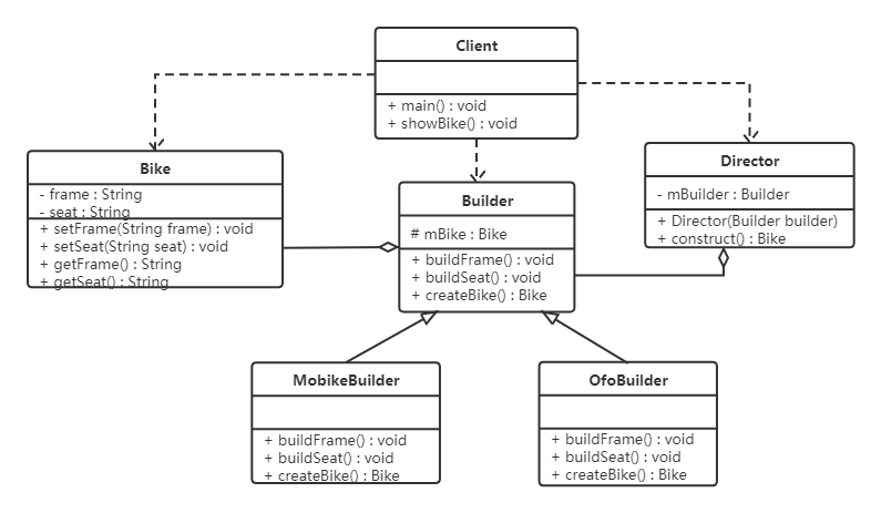 这里Bike是产品,包含车架,车座等组件;Builder是抽象建造者,MobikeBuilder和OfoBuilder是具体的建造者;Director是指挥者。类图如下: