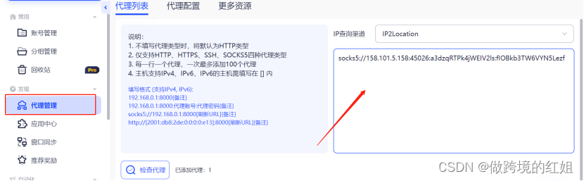 - 进入指纹浏览器,在代理管理粘贴复制的代理信息(各个指纹浏览器功能显示不同,但大同小异)。
