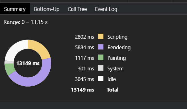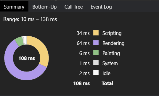 综上的一些小普及,在中间某一段 FPS 可以达到 60(顶峰)。其余多数是一半。在 FPS 达到顶峰的时候,CPU 占用明显降了下来(因为就在那一会我点了优化,可以看到 CPU 的颜色图,黄色(JS 脚本)明显少了,紫色(重排)也少了许多,绿色(页面重绘)代替了一部分工作)