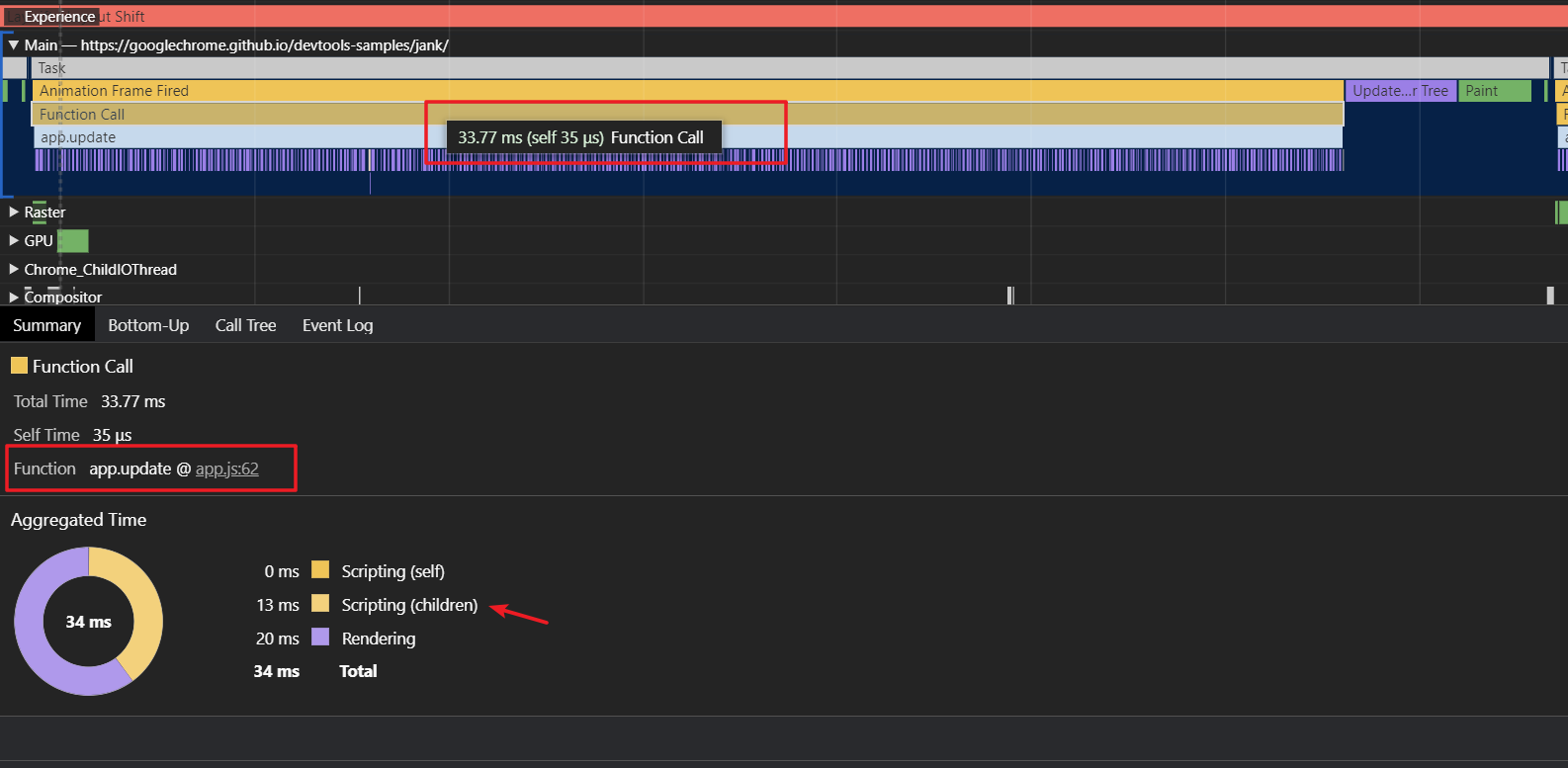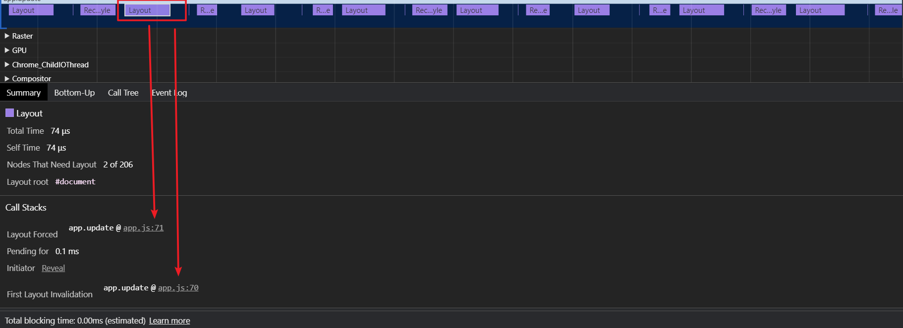 可以看到,已经定位到了某一个具体的 JS 文件,而且这段脚本运行了 20ms。重排占据了20ms。看来还是要减少重排的问题啊!
