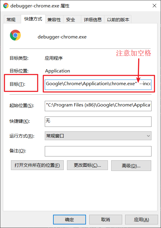 重点来了:在桌面的快捷方式右键打开属性。记得是新的 chrome 快捷方式打开属性。在目标一栏最后面填入: