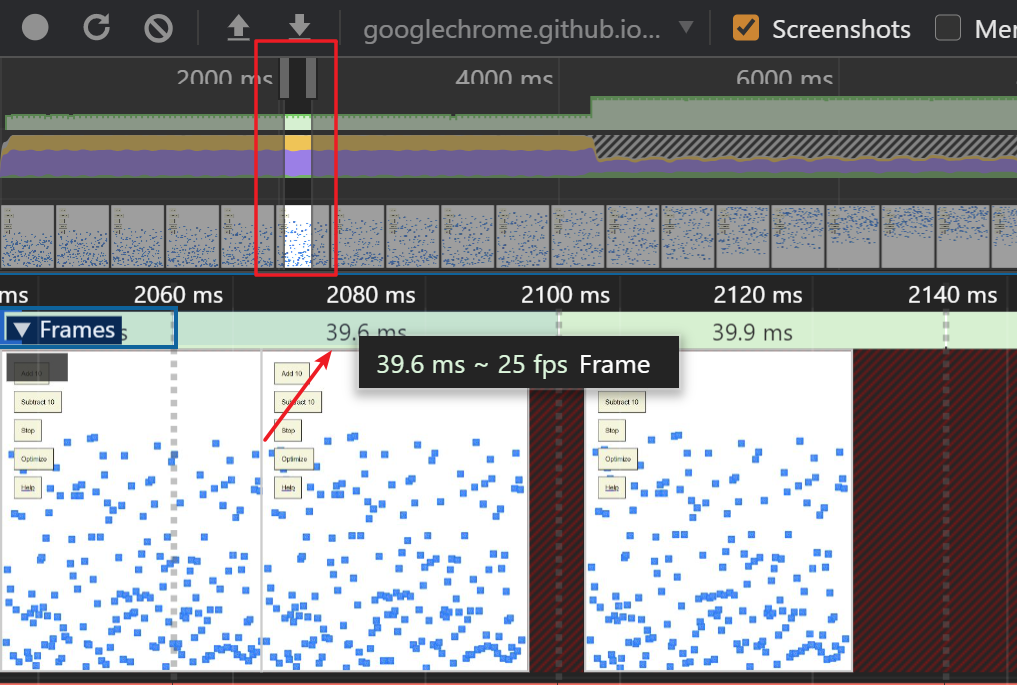 鼠标放在 Frames 上,可以看到某一帧的 FPS 值