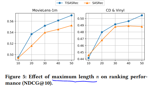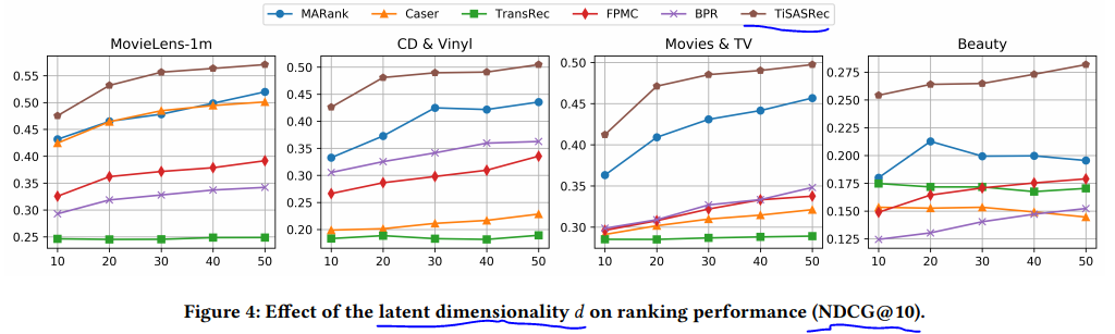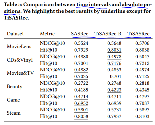 作者们试验了不同的场景下TiSASRec的特性,并且对比了不同位置编码下自注意力的效果。实验结果表明,该方法在稀疏和稠密数据集上多个评价指标均优于STOA序列模型。