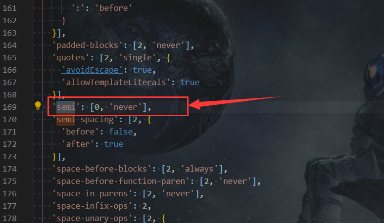 此配置项的意思为:eslint 不检查分号这一项,这个时候结尾的分号,你加也可以,不加也可以