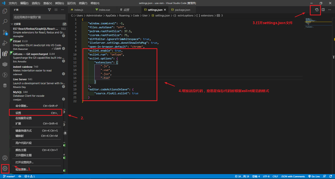 "eslint.enable": true,"eslint.run": "onType","eslint.options": {"extensions": [".js",".vue",".jsx",".tsx"]},"editor.codeActionsOnSave": {"source.fixAll.eslint": true}